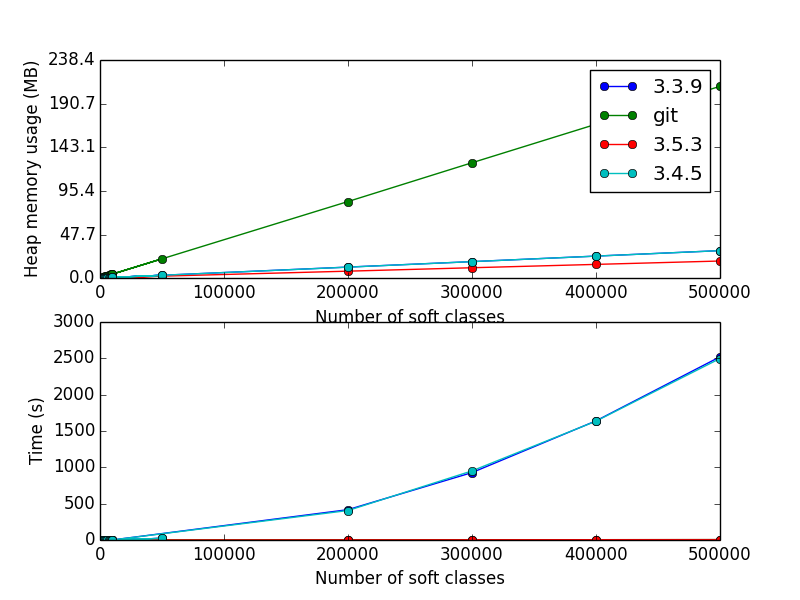 To define 500 000 classes, 3.5.3 and git versions are very fast (5 seconds), while 3.3.9 and 3.4.5 versions are very slow ( 2500 seconds)